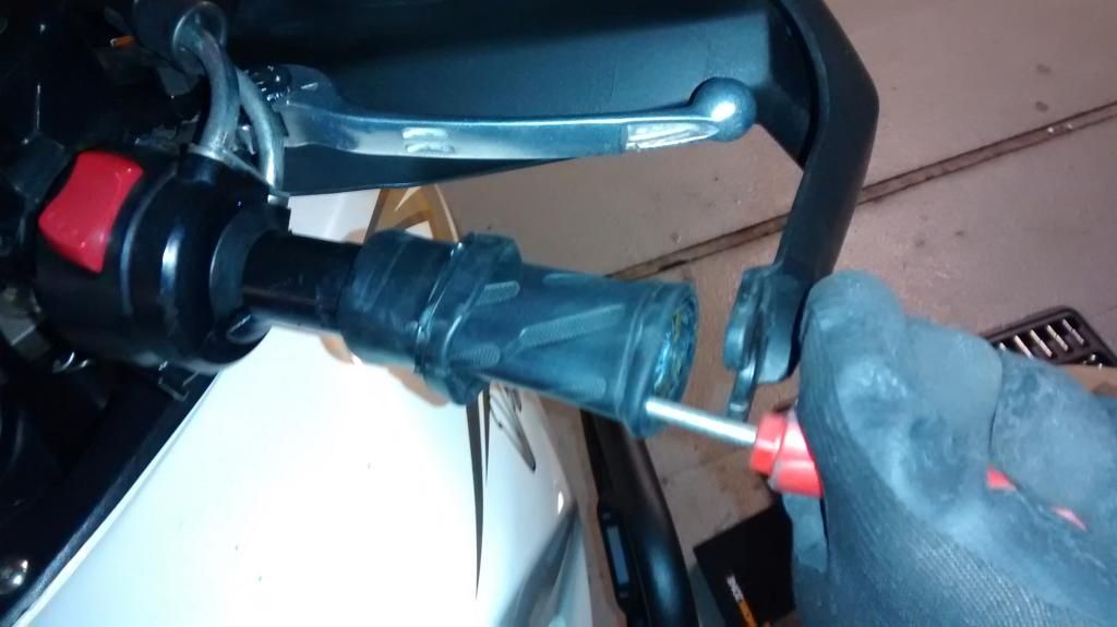 The Clutch Side Grip is easier to remove as it doesn't have ridges or plastic stop ends to remove it. With a thin flat head screw driver stick it under the grip surface. Slid the screwdriver under the grip until its at the end. Then rotate it under the grip around the circumference of the handlebar. do this several times as it removes the glue underneath. With the screwdriver still under the grip twist the grip with one hand and pull it away. Keep winding it backwards while twisting and the grip should come right off.