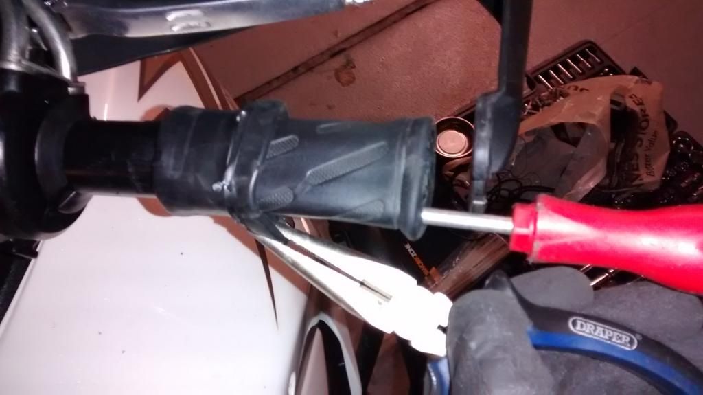 First you have to pull the grip away from the end part of the throttle. The grip is wrapped on the end plastic retainer and pulls aways from the throttle as below.