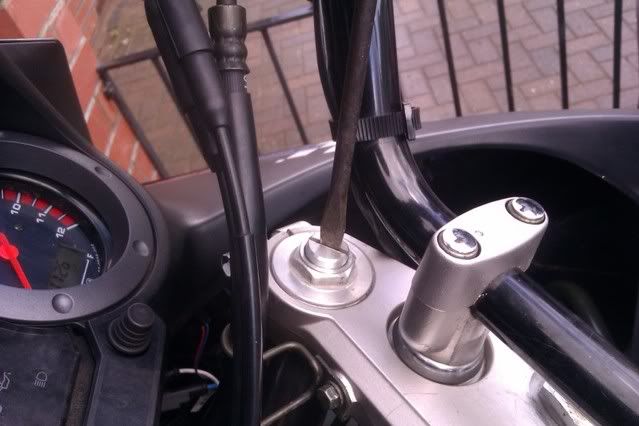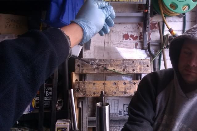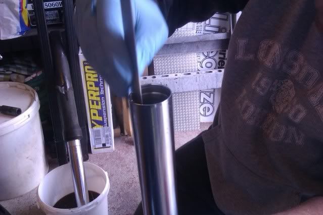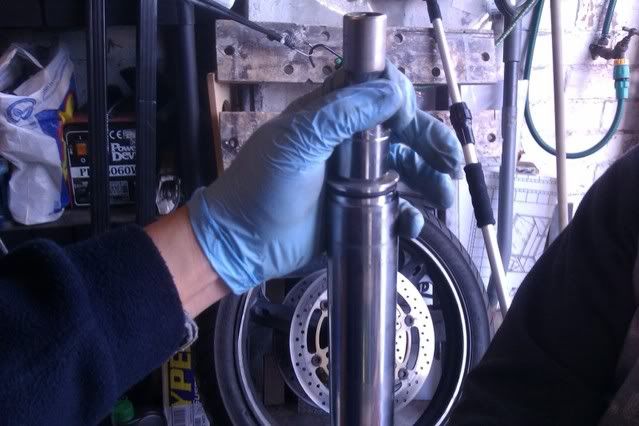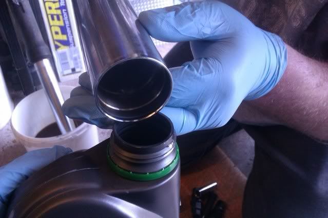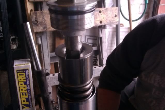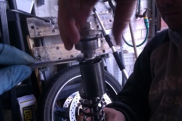 Now you have them both filled, you're ready to extend the stanchion, shaft and replace the new spring, however this is where it gets tricky. When you let go of the shaft to place the spring over it, it wants to drop down into the fork. To prevent this, use a bit of welding rod and wrap it around the lock nut. Use this to pass through your spring, washer and spacers ;) Also, you need to adjust the lock nut to the correct height. You need to measure 10.5mm from the top edge of the lock nut, to the top of the threaded shaft. In laymans terms, you need 10.5mm of exposed thread for the top cap to screw onto. I had enough slack to adjust this when I had all the bits back togather as per the next step.