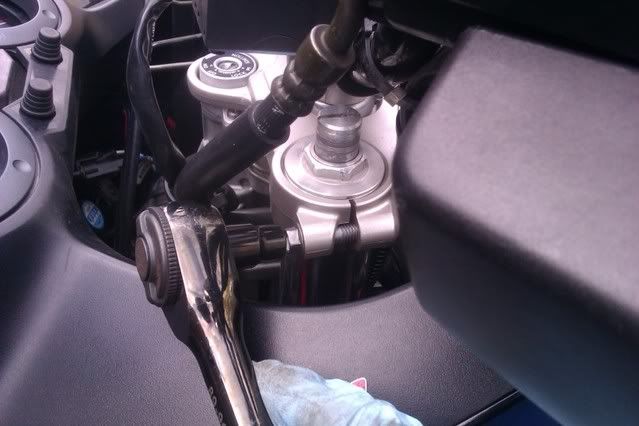 Now the forks are freed up at the bottom end, its time to drop them out. Using a 10mm socket, loosen the 2 lower yoke pinch bolts.