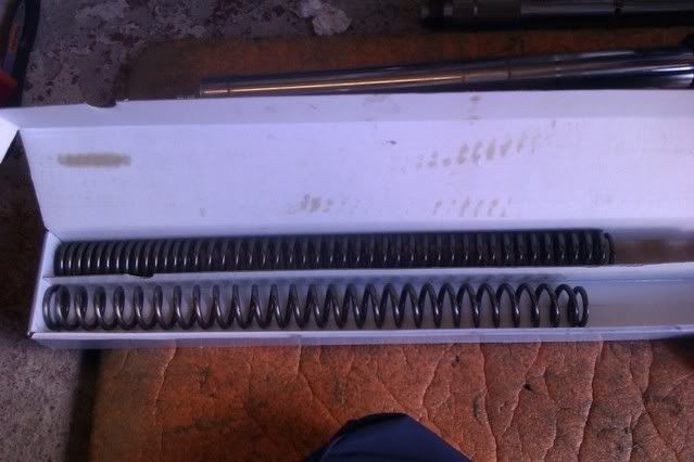 Once the old springs were off, I sized them up against my new ones. They were a tad shorter, 22mm in my case. New Spring - Top, Old Spring - Bottom