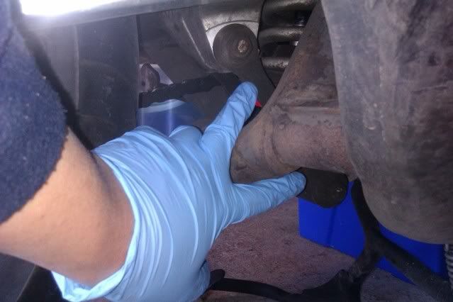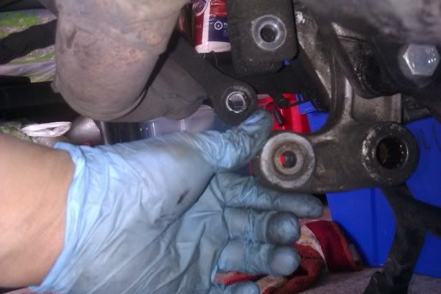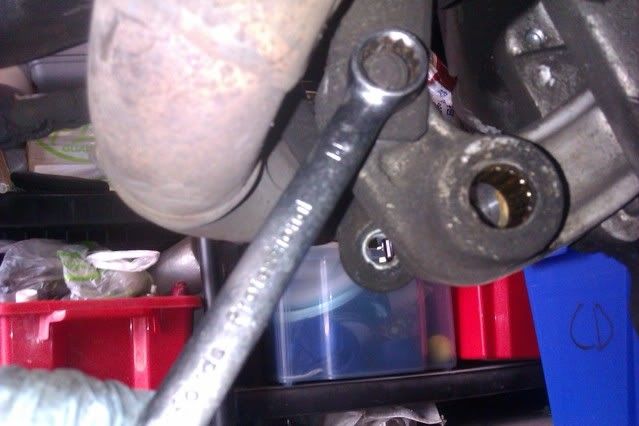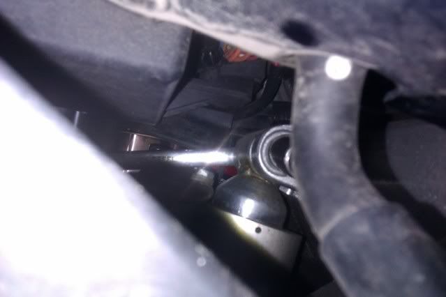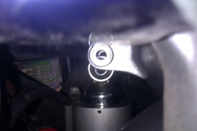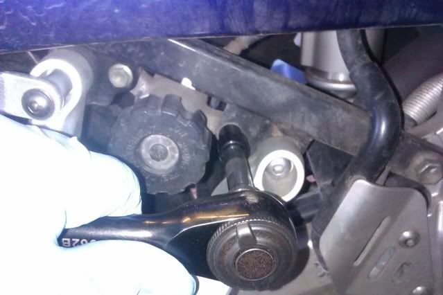 Using a 24mm Spanner, crack open the strut tops while they are being held by the yoke, just a couple of turns.