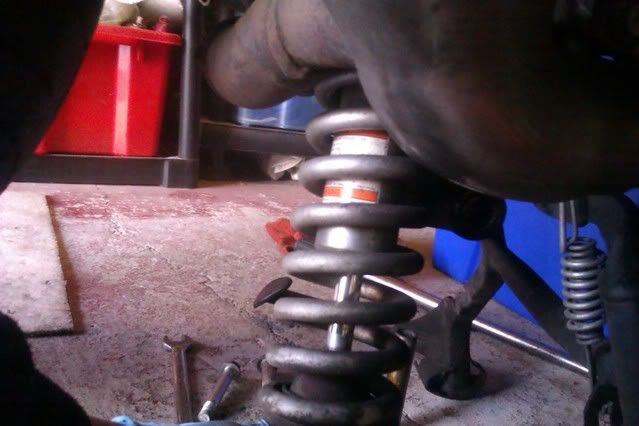 Spring, flat washer, spacer, dished washer under the locknut, then top cap. Double check your 10.5mm of exposed threads before replacing the top cap. The lock nut and dished war will hold everything in place so don't worry. Use your 2x 14mm spanner and nip it tight.