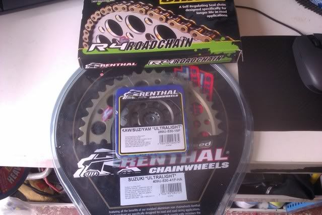 Renthal Ultralight 16T Front(289U-530-16), Ultralight 41T Rear(409U-530-41HA) and Renthal R4SRS 530 Gold X Ring Superbike Chain (112 link)totaling £153.00 delivered from A&R Racing. I opted to go down 1 tooth on the front sprocket. If is want to go back to stock, then all I need is the 17T front, which is cheaper too.