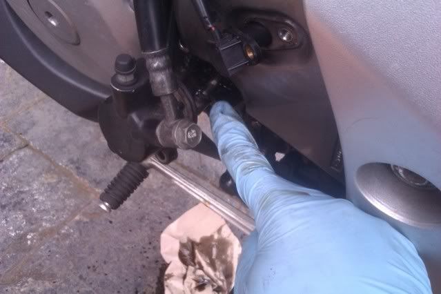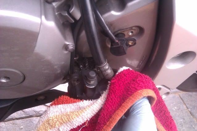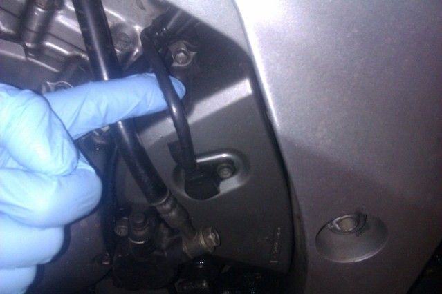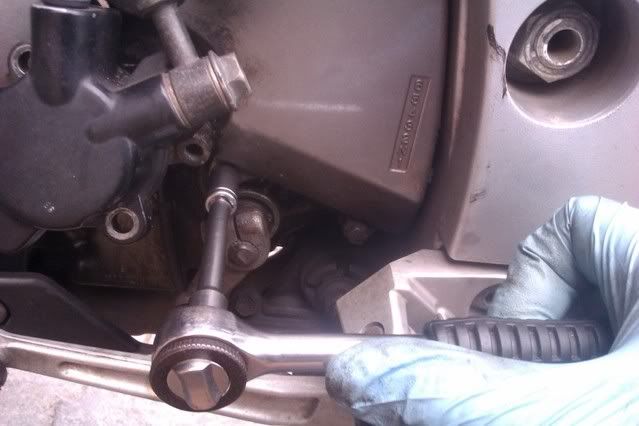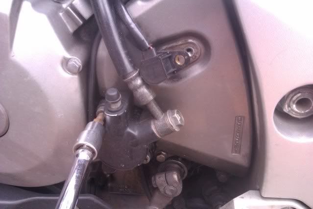 3) Rear sprocket bolts x5First undo the speed sensor from the side of the front sprocket cover. I think this was a 4mm allen key. Then undo the 2x 6mm allen heads hold the clutch slave cylider in place. (Note: the top slave cylinder bolt passes through an aluminium sleeve, you need to retrieve that later when the covers off if it doesn't come out with the bolt.