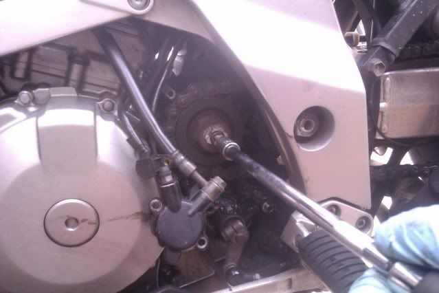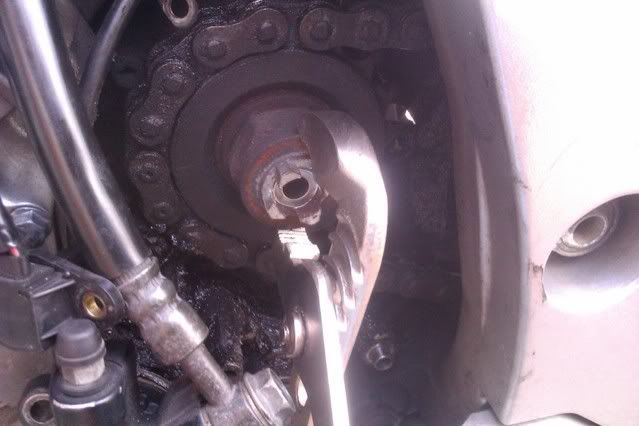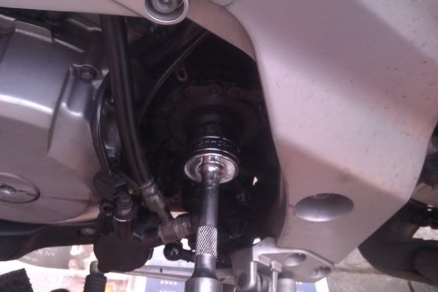 Now you can tackle the 32mm front sprocket nut. Mine was stuck solid and I had to use a windy gun. This is where the how to with pics ends.