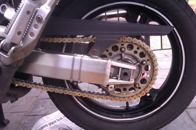 Now I started doing a How To but then ran into a problem with the front sprocket retaining nut and couldn't get it off at home, so had to go to my mates garage, where I didn't bother taking any further pics till it was done. I didn't have the time and had to get it done asap.